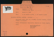 | Description: | Battered upper part of a fairly typical handle, rather bright in colour. Large rectangular impression shallow at lower right; worn. | |