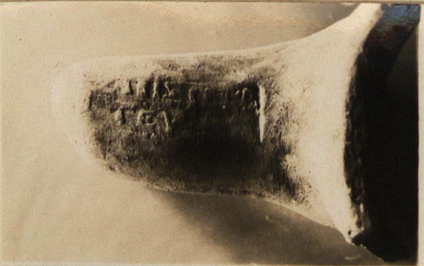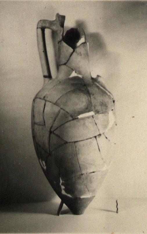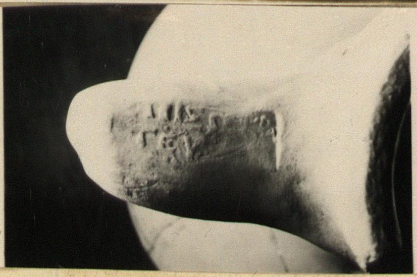 | Description: | Jar missing tip, one handle, much of neck and part of wall; rim on flat topped collar set off by a depression; no groove. Strengthened with plaster. Capacity: (revised from wheat VG 1939 of 25.800) 26.300. Rectangular stamp. | |