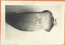 | Description: | High arched, thick; finger groove under angle; below this almost cylindrical. Rather coarse brick red clay; greyish at core; pinkish cream slip; slightly micaceous. Monogram; slightly incomplete upper edge at right. | |