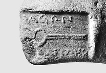 | Description: | Curve fragment of typical handle. Micaceous light reddish-buff clay, with redder ring near surface. Impression set to one side of rib so that it is slightly incomplete below; left end broken away and chipped; handle of caduceus a double bar. | |