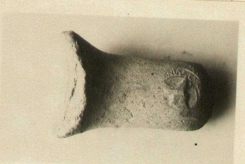 | Description: | Elongated upper part. Fired light clay. Two-thirds of circumference of impression missing; what is complete is clear; boukranion. | |