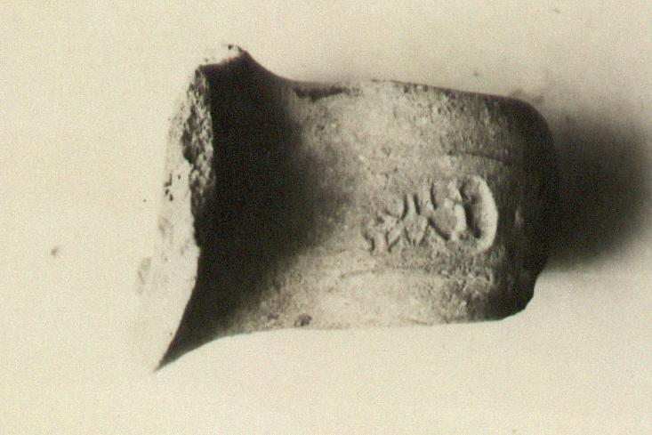 | Description: | Arched short part. Coarse hard red clay; surface dark under remains of peeling slip. Impression incomplete to left; fresh; herm. | |