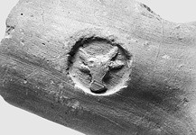 | Description: | Handle with low arch. Hard clay, fine-grained but containing bits, at surface yellowish-red, with large core, brownish or reddish. Circular stamp the size of a coin impression; boukranion. | |