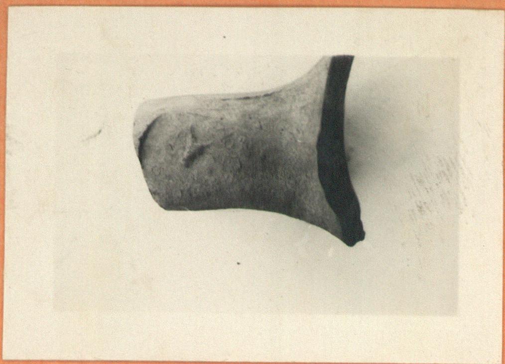 | Description: | Level, broad; broken before curve. Coarse brick red clay, yellowing to surface, greying to core; cream slip. Impression incomplete in both sides; much worn. | |