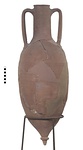 Description:   Whole jar preserved; long slender body with pointed ringed toe; no angle at shoulder; high neck narrowing slightly at top; rolled rim;horizontal surface of handle rises only very slightly higher than point of juncture with neck; handles rise from shoulder and join neck below lip.