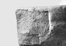 Description:   Rectangular stamp with down-curve; on end, chipped away.