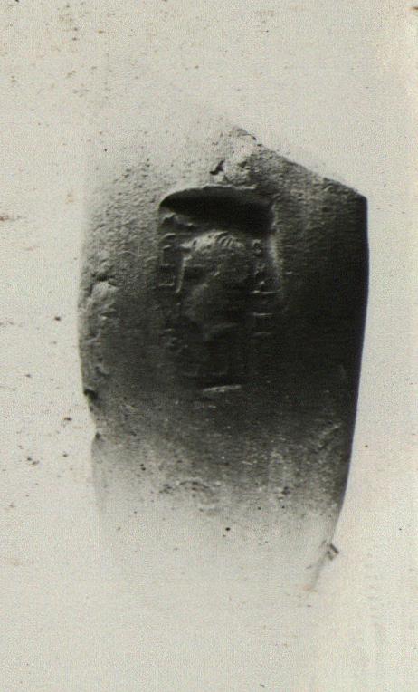 | Description: | Broad curve handle. Micaceous reddish-buff clay. Rectangular stamp, slightly on outside of curve; at centre, woman’s head, left; letters around all four sides. Early Thasian. | |