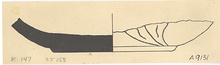 Low flat-bottomed base; thick, curving sides. At one side, on outside wall, part of a deeply incised design.