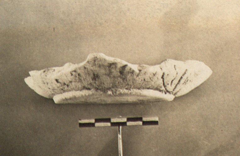 | Description: | Fragment preserving about half the foot and lower walls. Low flat-bottomed base; thick, curving sides. At one side, on outside wall, part of a deeply incised design. Inside very smoothly polished. White marble. | |