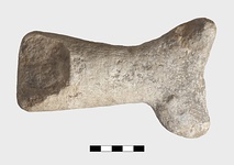 | Description: | Fragment missing at grinding end. Minor fractures. Handle shaped like a fish tail. Coarse grained grayish marble. | |