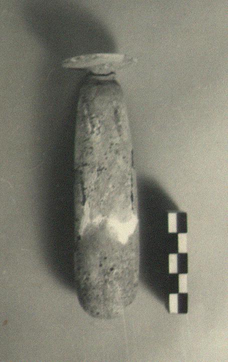 | Description: | Broken; partly repaired, much splintered and rotted. Lugs on either side with tassels in slight relief. Thin and fragile stone. | |