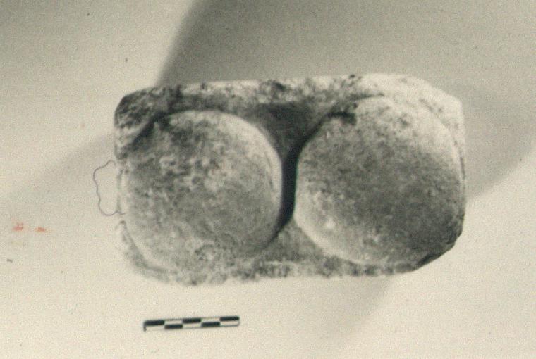 | Description: | Mastoid weight; complete except for chips. Solid heavy marble block with two tangent half-spheres carved on its upper surface. Pentelic marble. | |