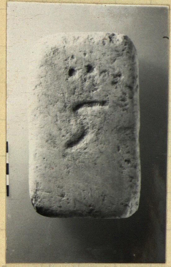 | Description: | Plain rectangular block, with a letter and two dots on one side. Island marble. <graphic> | |