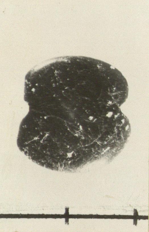| Description: | Intact. Shield-shaped, lentoid. Pierced vertically. Similar to ST 498 (H 676), but without the four depressions which on that suggest a seal stone. Black steatite. Addenda 2025: Bluish black (GLEY 2 2.5/5PB) fine-grained stone. Steatite likely. Either a very worn or perhaps unfinished Mainland Popular Group seal stone (TVD) LH IIIB–C by context. | |