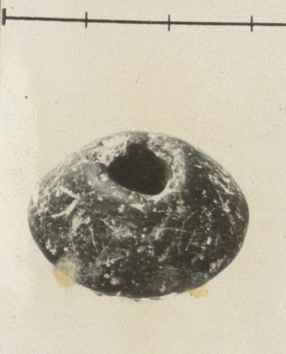| Description: | Intact save minor chips. Pierced. Double conical shape. Steatite. | |