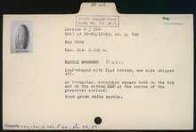 | Description: | Loaf-shaped with flat bottom; one side chipped off. An irregular, scratched square both on the top and on the bottom, each at the center of the preserved surface. Poor grade white marble. | |