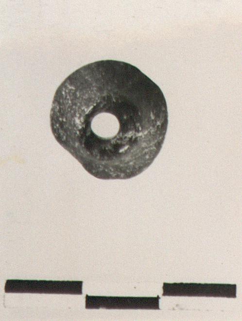 | Description: | Small concave, conical whorl or button. Chip missing. Dark gray stone, speckled with white. | |