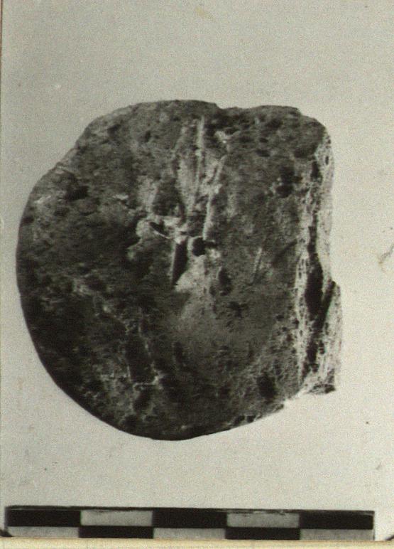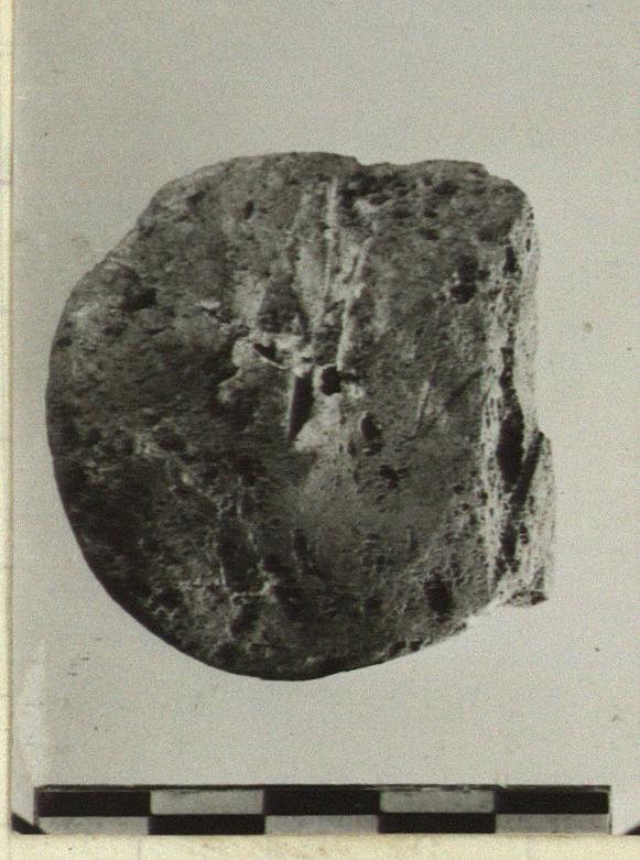 | Description: | Flattened on several sides by wear. Small stone, one of four or five similar ones found in the pit. | |