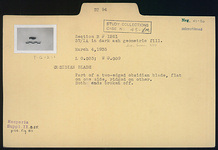 | Description: | Part of a two-edged blade, flat on one side, ridged on other. Both ends broken off. | |
