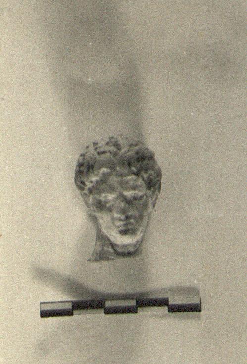 | Description: | Broken at the back. A head with masses of short curly hair; twisted to the right. White paint on the face, with traces of yellow over it; dark red on the hair. | |