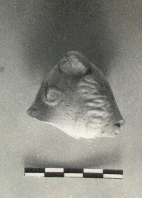 | Description: | First interpretation: bear 's head. Part of left side of dog 's head; the muzzle missing. Red paint. Buff pink clay. Cf. T 1510. | |