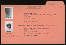 | Description: | Hair rises high above forehead. Eyes pierced. Mask open behind. No trace of paint. Fine brownish red micaceous clay. | |