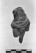The figure is that of a fat man. The right arm was bent back at the shoulder. The left is bent at the elbow and holds in place the garment which hides the hand, passes round the small of the back and returns across the portly abdomen to hang over the forearm. Tucked in the folds, left side, is a club (? or torch of which top is missing ?).