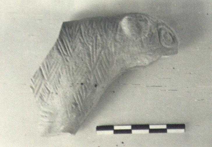 | Description: | A fragment of the right half of the two casts comprising the animal. Muzzle, legs and rear of body missing. The bear looks right. Large eye and ear. Fur indicated by small chevron-like grooves. Traces of yellow (?) paint. Light red clay. Cf. T 1421. | |