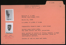 | Description: | Broken away below neck. The head intact and well preserved. Hair parted in center at front; behind a high headdress decorated with vertical lines of herringbone pattern. Traces of red paint on face and neck. Late Roman. | |