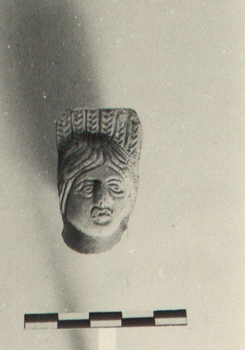 | Description: | Broken away below neck. The head intact and well preserved. Hair parted in center at front; behind a high headdress decorated with vertical lines of herringbone pattern. Traces of red paint on face and neck. Late Roman. | |