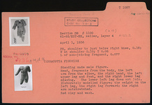 | Description: | Head, fragments from the body, the left arm from the elbow, the right hand, the left upper leg and foot, and the right lower leg missing. The lower left leg does not join. The weight on the left leg, the right leg forward; the right arm outstretched. Red clay and wash. | |