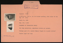 | Description: | One edge preserved; elsewhere broken all around. Perhaps part of a seated female figure in a plain chiton (?) Coarse light red clay. | |