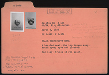 | Description: | A bearded mask. The top broken away. Mouth open; eyes not pierced. Traces of red paint. Red clay. Cf. T 1468. | |