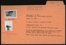 | Description: | A bird, on a heavy base. Intact except for missing head and neck. Small hole in base. Crude representation of a bird. Little modelling; grooves where the moulds join. Much red, white and yellow paint. Buff clay. | |