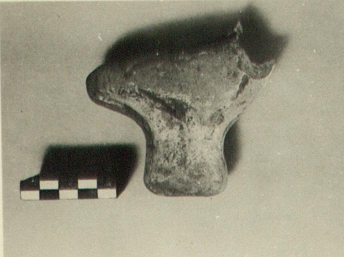 | Description: | A bird, on a heavy base. Intact except for missing head and neck. Small hole in base. Crude representation of a bird. Little modelling; grooves where the moulds join. Much red, white and yellow paint. Buff clay. | |