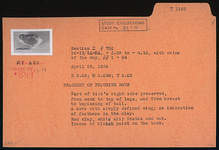| Description: | Part of right side of the figurine preserved, from neck to top of legs, and from breast to beginning of tail. A dove with simply defined wing. No indication of feathers in the clay. White slip inside and out. Traces of bluish paint on the back. Red clay. | |