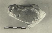 | Description: | Part of right side of the figurine preserved, from neck to top of legs, and from breast to beginning of tail. A dove with simply defined wing. No indication of feathers in the clay. White slip inside and out. Traces of bluish paint on the back. Red clay. | |