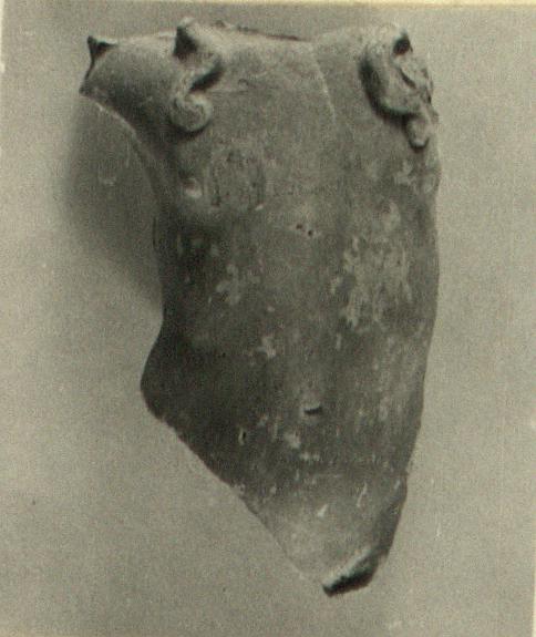 | Description: | Front preserved from collarbone to groin; right hip and arms missing. The right hip thrown out as if the weight were on the right foot. A strand of curly hair on each side of the chest. Well defined muscular modelling. Red paint. Buff clay. | |