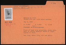 | Description: | Front of head only preserved, above chin. Hair in narrow parallel waves at right angles to face. Red paint. White slip. Red clay. | |