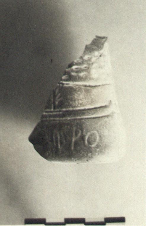 | Description: | Lower right corner of front of signed base preserved. Plain base, above which grooves, and a small leaf. Above, pitted surface. Signature: Α Φ Ρ Ο, inscribed in the unbaked clay on the lower part. Traces of white paint. Red clay. <graphic> ADDENDA: Lower right corner of front or back preserved. | |