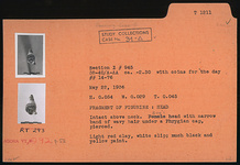 | Description: | Intact above neck. Head with narrow band of wavy hair under a Phrygian cap, pierced. White slip. Much black and yellow paint. Light red clay. | |