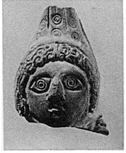 | Description: | Front of head only preserved. Characterless face with large nose and eyes. Tightly curled hair surmounted by a peaked cap which is ornamented with the same stamped circles used for the eyeballs. White slip, yellow paint. Buff clay. | |