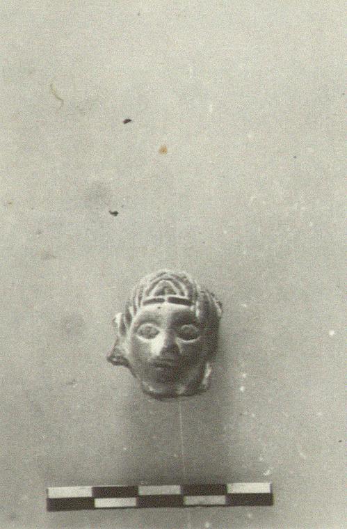 | Description: | Hair brushed back and up from the face, forming an inverted V over center of forehead. Cloak carried over back of head. Traces of white, red and yellow paint. Hard red brown clay. ADDENDA: Same mold as T 1224. | |