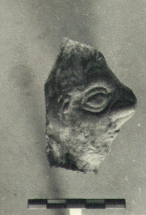 | Description: | All of face preserved, broken behind. Male face with short beard, curly hair, large almond-shaped eyes. White slip, yellow and red paint. Red clay. | |