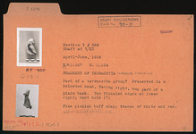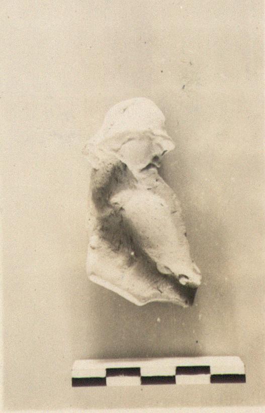 | Description: | Preserved is a helmeted head, facing right, and part of a plain back. Two finished edges at lower right. Vent hole (?) Traces of white and red paint. Fine pinkish buff clay. Part of a group (?) ADDENDA: C. Grandjouan: Warrior behind shield. | |