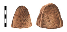 | Description: | Fragment with one edge, curving, preserved. The inside of the mold covered with irregularly placed nodules. Pink clay. | |