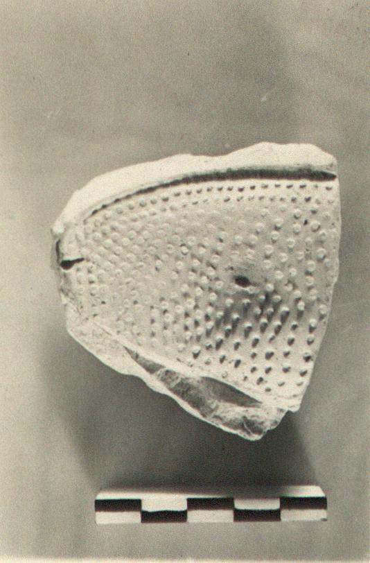 | Description: | Fragment with one edge, curving, preserved. The inside of the mold covered with irregularly placed nodules. Pink clay. | |