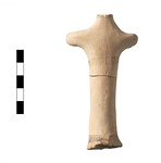 Glaze bands around base, body below arms, across shoulders in front and around neck; coarse diagonal glaze strokes on chest; Dull black glaze.