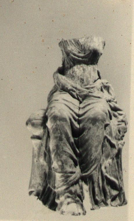 Preserved from hip line down, with a bit of the plain back above. Back of chair legs missing. Left forearm under drapery preserved. Hand, which was separate piece, missing (not hole for attachment).