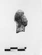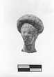 | Description: | Broken below neck. Otherwise intact. Very large heavy wreath. Solid head with features sketchily modelled. White slip with traces of yellow on face and pink on headdress. | |